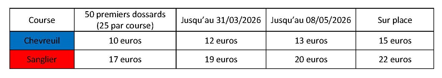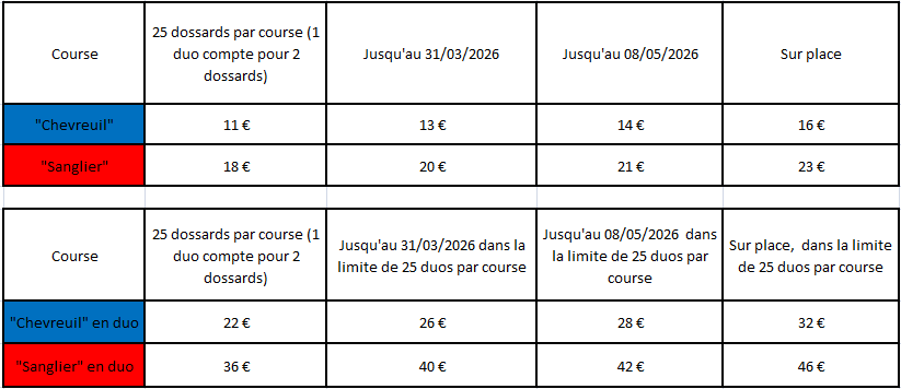 Majoration de l’inscription sur place (16€ pour la course « Chevreuil » et 23€ pour la course « Sanglier ». Paiement par chèque, CB ou espèces. Tout dossier incomplet entraînera un refus de départ.